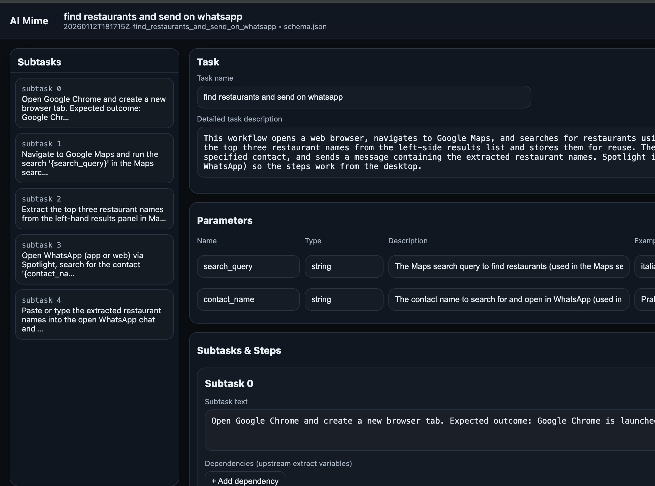 Refine recordings into parameterized subtasks with clear inputs and dependencies.